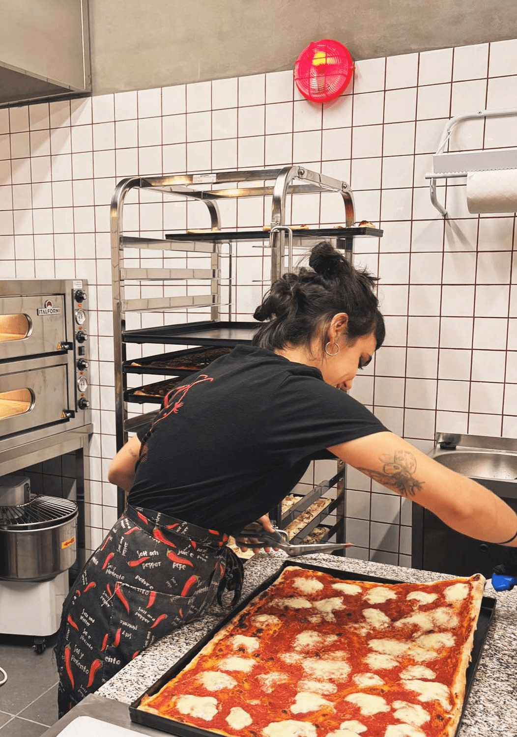 O projecto é da chef Joana Paramés, conhecida por “Joaninha”, que passou por Roma para aprender o método tradicional da pizza al taglio. Ao contrário da pizza redonda clássica, aqui a pizza é feita em tabuleiro, cortada em rectângulos e vendida à fatia, com base alta, duas cozeduras e uma textura pensada para ser comida à mão.